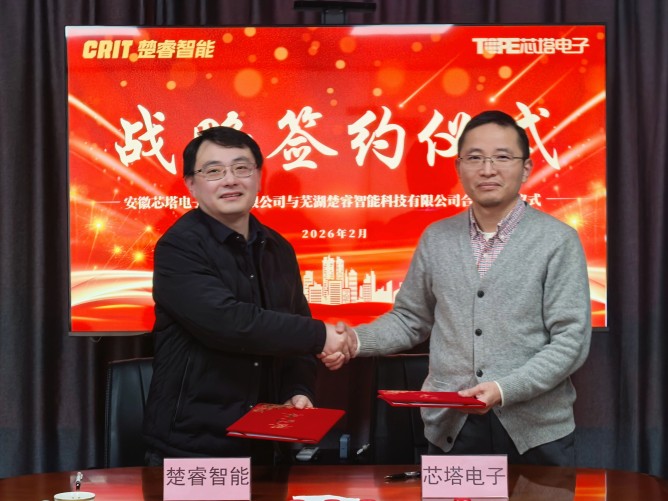 安徽芯塔电子科技有限公司与芜湖楚睿智能科技有限公司举行战略合作签约仪式。芯塔电子董事长兼总经理倪炜江博士与楚睿智能常务副总汪明先生分别代表双方签署协议。