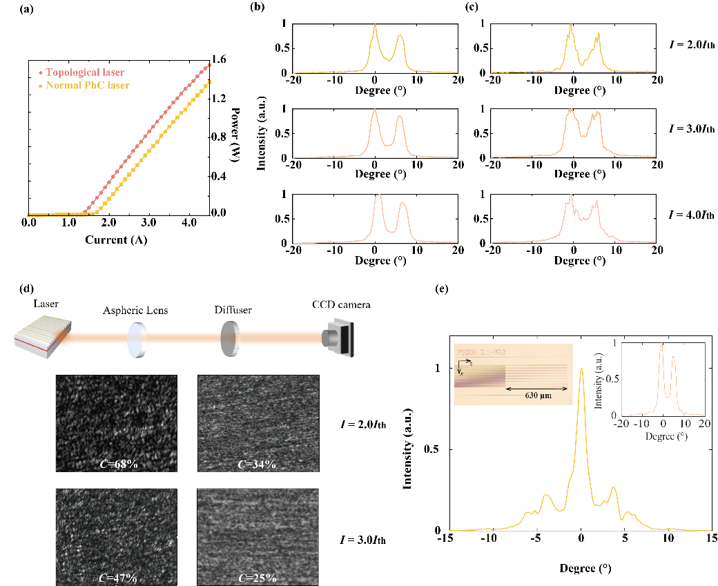 研究团队从经典一维拓扑Su-Schrieffer-Heeger(SSH)模型出发,利用结构的手征对称性保护特性,调控SSH晶格中的单元耦合强度,实现拓扑边界态在实空间中的离域化分布;同时,借助基于图形化电极结构的非厄米调制,离域化的拓扑边界态能够在无序背景中保持主导地位,呈现出独特的自组织模式。与同等规模的光子晶体激光器相比,该拓扑激光器具有更高的空间相干性,这使其展现出更低的阈值、更稳定的输出空间模式以及更高的散斑对比度,同时,进一步扩大了拓扑边界态的空间分布规模,并引入移相耦合器以提升输出光功率密度。