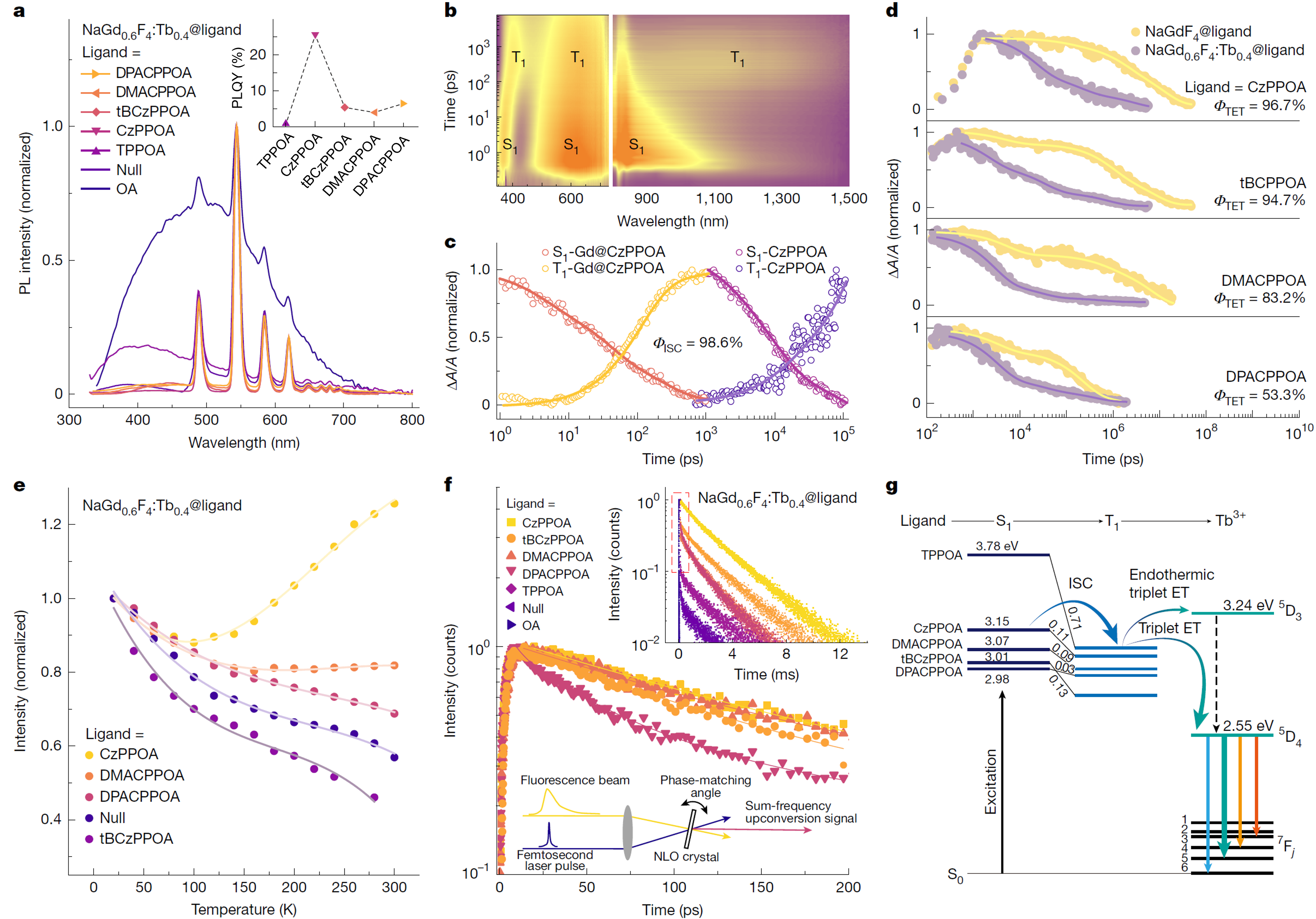 为了确认镧系纳米晶和有机分子杂化界面处的光物理过程,团队采用多种瞬态光谱技术和变温光谱技术,观测到有机分子受镧系纳米晶诱导加快系间窜越速度(<1ns),系间窜越效率98.6%。其中,咔唑修饰的膦氧化物(CzPPOA)表现尤为突出,其与镧系离子间实现了高达96.7%的三线态能量转移效率。进一步研究表明,该快速的三线态能量传递得益于能级匹配的吸热三线态能量传递和界面无辐射损耗的显著抑制。该超快机制的阐明帮助理清界面三线态激子注入绝缘纳米晶的设计准则和优化方向。