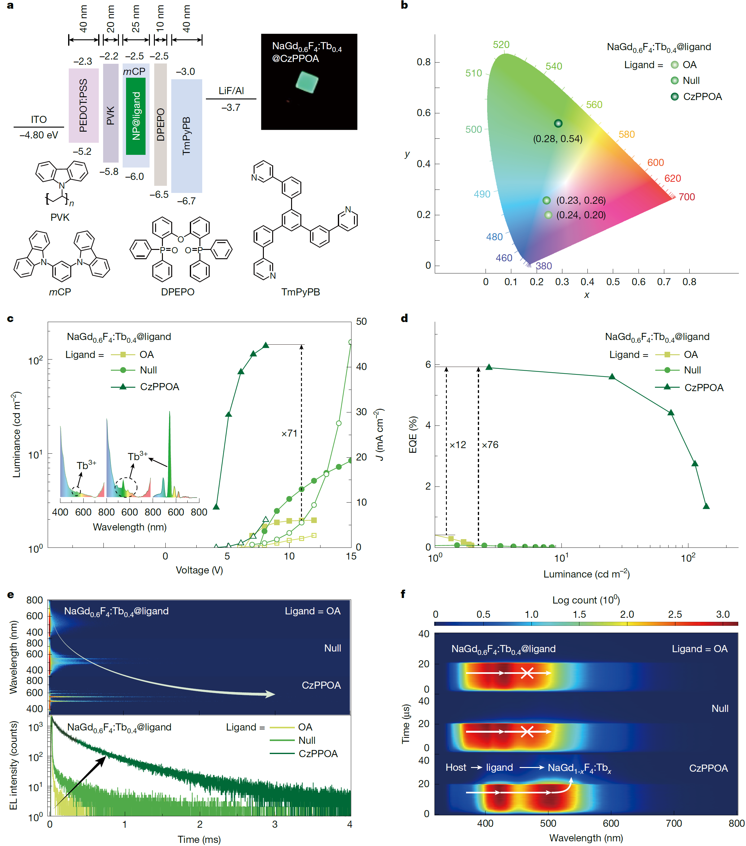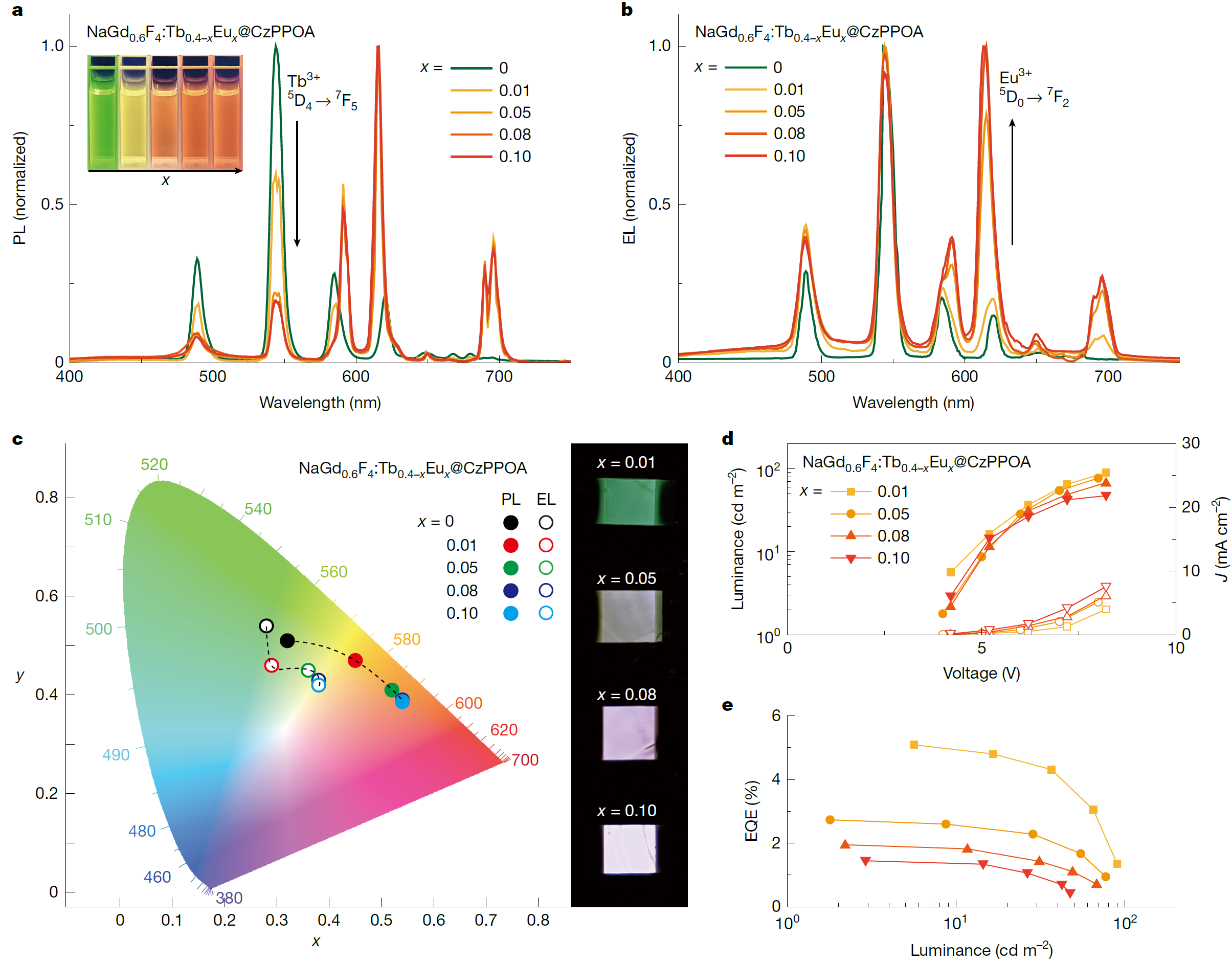 研究成果以“捕获电生激子实现可调谐的稀土纳米晶体电致发光”(Electro-generated excitons for tunable lanthanide electroluminescence) 为题,于当地时间11月19日发表于《自然》(Nature)。